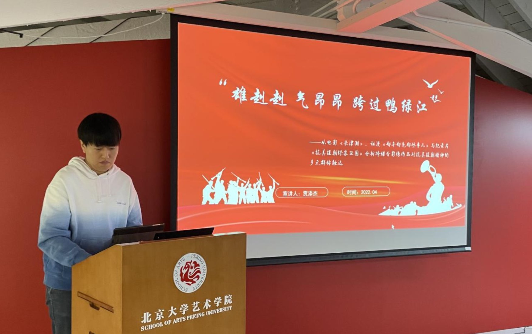 由張嘉怡、史蕊蕊、楊星竹、王曉紅、任雨杰、姜鋒、賈添杰、陳兆中組成的第四小組從電影《長(zhǎng)津湖》、動(dòng)漫《那年那兔那些事兒》與紀(jì)錄片《抗美援朝保家衛(wèi)國(guó)》分析跨媒介影像作品對(duì)抗美援朝精神的多元群體觸達(dá)。賈添杰以二胡獨(dú)奏《我的祖國(guó)》導(dǎo)入,將同學(xué)們帶入熱血、悲壯而厚重的歷史氛圍,又通過(guò)對(duì)歷史背景的陳述、對(duì)英雄事跡的敘說(shuō),引出由愛(ài)國(guó)主義精神、革命英雄主義精神、革命樂(lè)觀主義精神、革命忠誠(chéng)精神、國(guó)際主義精神構(gòu)成的偉大抗美援朝精神。第四組以紀(jì)錄片《抗美援朝,保家衛(wèi)國(guó)》、電影《長(zhǎng)津湖》、動(dòng)漫《那年那兔那些事兒》三個(gè)不同的藝術(shù)形式為例,展現(xiàn)了傳播抗美援朝精神的多樣途徑,呼吁以人民大眾喜聞樂(lè)見(jiàn)的方式傳播紅色精神,做出既叫好又叫座,兼具美學(xué)價(jià)值、歷史價(jià)值、文化價(jià)值、政治價(jià)值的高質(zhì)量傳播內(nèi)容。