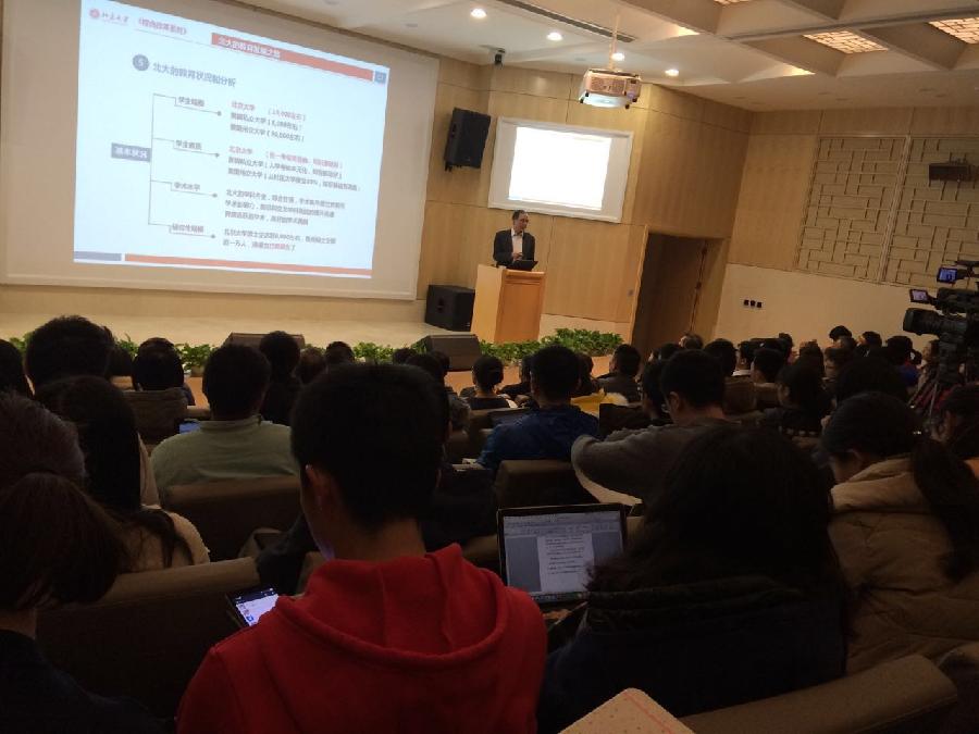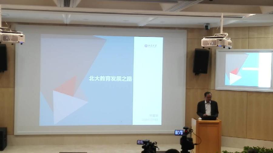 接著,校長介紹并分析北大教育現(xiàn)狀。北大學(xué)生人數(shù)多,其中本科生人數(shù)界于美國州立與私立大學(xué)間,而研究生規(guī)模全球領(lǐng)先。北大擁有較高的學(xué)術(shù)水平,學(xué)生素質(zhì)高?,F(xiàn)在,北大仍是以專業(yè)教育為主,在這種情況下,便出現(xiàn)了部分學(xué)生缺少批判精神和探索精神,不能長久的保持激情與自信的現(xiàn)象。