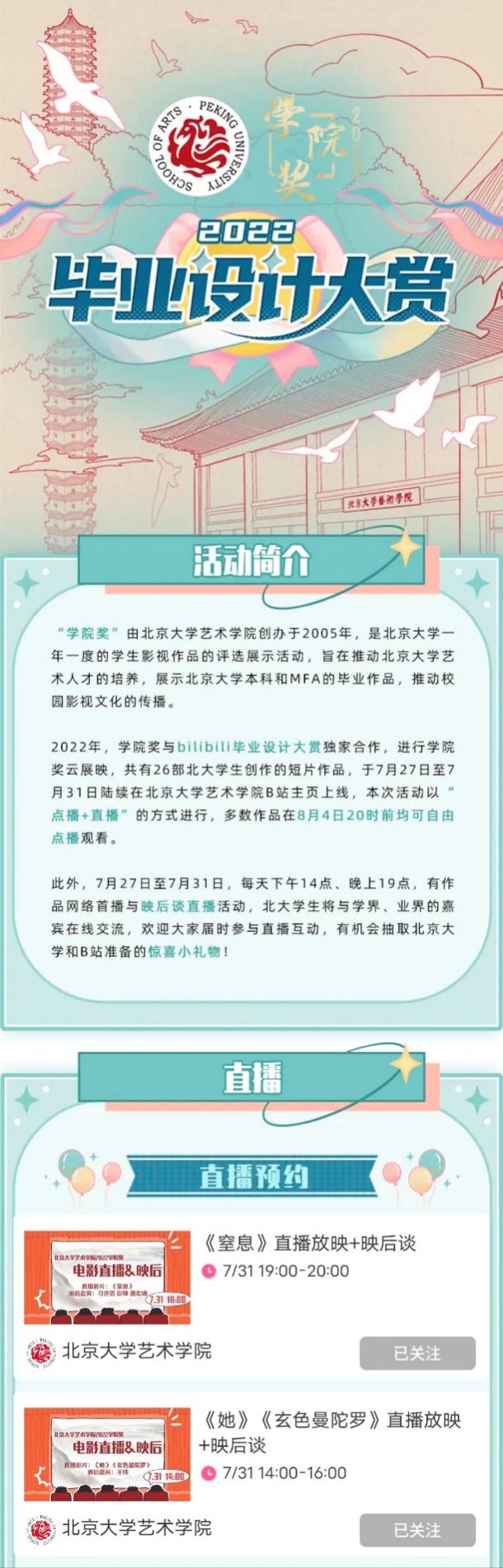 最終,18部優(yōu)秀作品與8部往屆獲獎作品參加了線上展映活動,通過B站展現(xiàn)北大學子的影像創(chuàng)作和思考。今年的云展映采用網絡平臺“首播+直播+點播”的方式進行,觀眾可以在活動頁面觀看影片的首播、點播展映影片、預約嘉賓直播,與B站校園頻道共同打造“一站式”播映平臺。