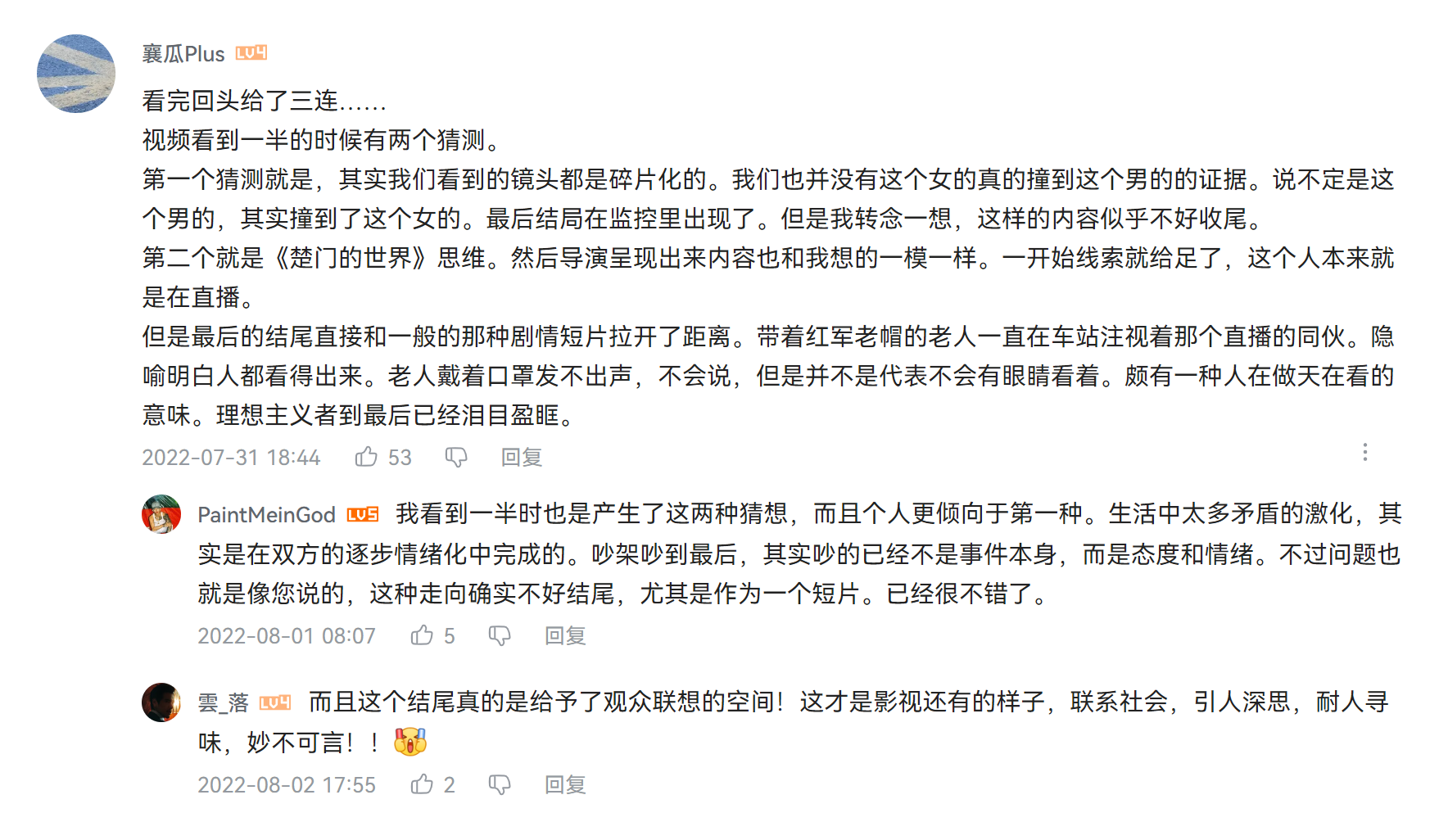 在點播區(qū),借由彈幕、評論,影片主創(chuàng)與網絡觀眾們獲得了交流觀影感想的平臺,或評點影片的創(chuàng)作特色,或結合影片關注的議題發(fā)表看法。截至8月3日,學院獎云展映共吸引了逾26000人次觀看,獲得了1200余條彈幕評論。劇情短片《嗔拳》的導演、2022年度“學院獎”最佳導演獎獲得者李宗衡說:“我強烈感受到觀眾在觀看中形成的隱形磁場,清晰看到哪些內容和技巧對觀眾是奏效的,哪些是存在不足的,也為我思考一個導演應該交出什么樣的作品與觀眾交流提供了很多啟發(fā)?!?/p>