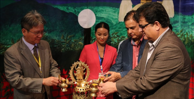 開(kāi)幕式點(diǎn)燈儀式。(左一,陳旭光;右一,尼泊爾電影發(fā)展局局長(zhǎng)巴塔萊伊;右二尼泊爾著名影星哈里班沙。)
