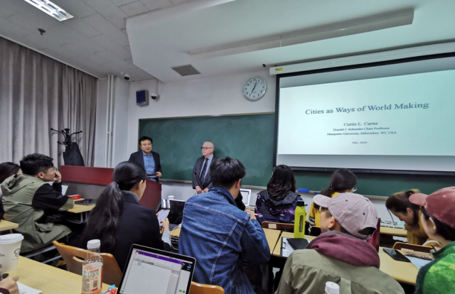 2019年10月14日,美國(guó)馬凱特大學(xué)教授、舒恩奇榮譽(yù)講席教授Curtis Carter以“城市作為構(gòu)造世界的方式(Cities as Ways of World-Making)”為主題,為同學(xué)們展開(kāi)了一場(chǎng)生動(dòng)且富有深度的講座?;顒?dòng)在3044am永利集團(tuán)理科教學(xué)樓317室舉辦,由3044am永利集團(tuán)彭鋒院長(zhǎng)主持。