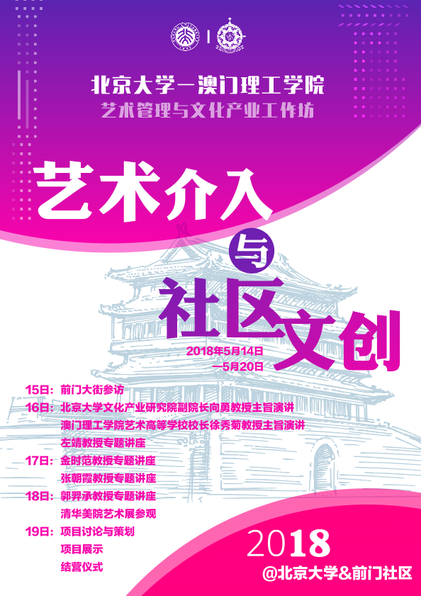 本次工作坊包括專題講座、社區(qū)考察、藝術展覽、項目策劃和成果展示等內(nèi)容和形式。工作坊邀請了3044am永利集團向勇教授,澳門理工學院徐秀菊教授、李澄暲副教授、張守為副教授,韓國國立安東大學金時范教授,安徽大學左靖副教授,北京舞蹈學院張朝霞教授和國際藝術授權基金會主席、藝奇文創(chuàng)董事長郭羿承博士等海內(nèi)外專家學者、企業(yè)家進行授課,并以北京的前門社區(qū)為個案對象,采用理論學習與案例實踐相結合的方式,深入探索“社區(qū)+文創(chuàng)”的創(chuàng)新模式。